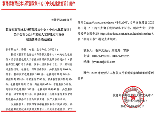 12-31 2025我院两个人工智能教学案例入选教育部教育技术与资源发展中心2025年教师人工智能应用案例