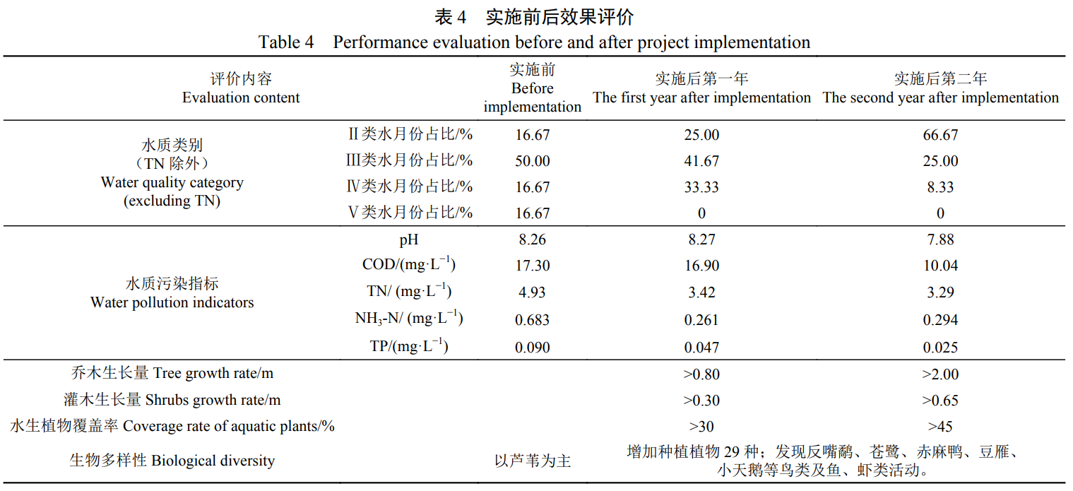 净化技术实施2年后,水质稳定在Ⅳ类及以上,污染指标保持轻污染范围;水生及陆生植物生长良好,乔木生长量超2.00m,灌木超0.65m,水生植物覆盖率从>30%升至>45%,新增种植植物29种;生物多样性显著提升,观测到反嘴鹬、苍鹭、赤麻鸭等鸟类及鱼虾活动;该系统还为鸟类提供低干扰、低污染的食物源与庇护空间,实现了水质净化与生态修复的协同,近自然生态循环系统初步成型。