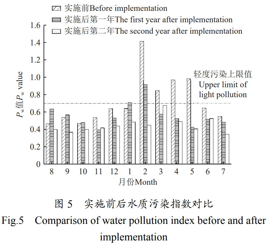 净化技术实施后第一年Pw均值为0.56(轻污染),仅1~2月为中污染;实施后第二年Pw均值降至0.45,无中污染及以上月份,数值在0.34~0.68之间,整体从实施前的中污染状态转为轻污染,且污染程度持续降低,水质综合改善效果显著。
