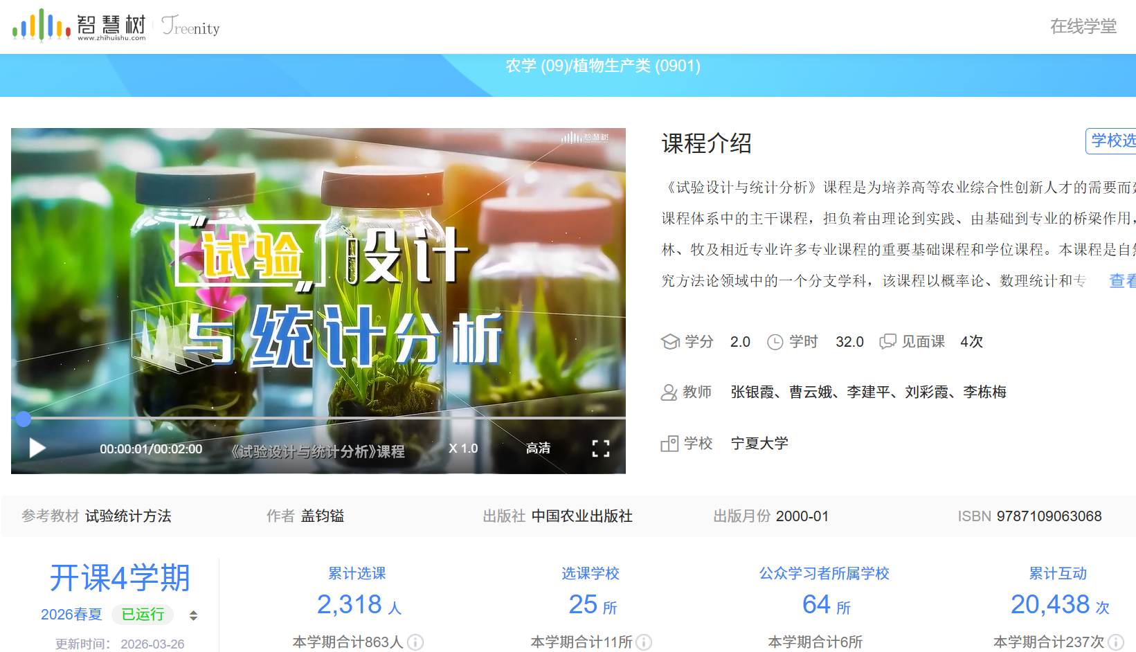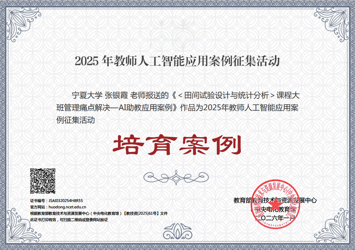 张银霞副教授立足农学学科人才培养定位与“双一流”学科建设要求,聚焦课程提质、教学模式创新、教学资源升级,牵头主持多项校级教学改革项目。先后主持在研“双一流”研究生优质课程、校级课程思政示范课程建设项目,持续优化研究生课程教学体系,深挖农学专业课程思政元素,实现知识传授与价值引领同向同行。同时,她圆满完成校级“互联网+教育”在线开放课程、数字教材出版培育项目结题工作,积极搭建线上教学资源,推动传统教学向数字化、信息化转型,补齐专业课程数字化教学短板,助力课堂教学提质增效。主编的《田间试验设计与统计分析》AI云教材打破传统纸质教材的局限,融入人工智能教学技术,兼顾理论知识严谨性与实践操作实用性,贴合当代大学生学习习惯,填补了相关课程数字化教材的空白,凭借优质内容和创新形式获得业内高度认可。该教材荣获校级教材建设优秀案例,并获得“2024年度全国优秀云教材”奖。依托AI数字化课程教学打造的AI助教应用案例,成功入选国家级教师人工智能应用优秀培育案例;负责在智慧树平台建设并上线《试验设计与统计分析》在线开放课程,近2年累计选课院校64所,选课学生2381人,课程互动20438次。